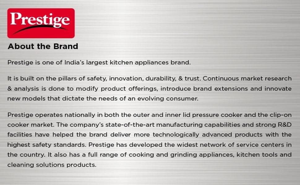 BODY: Prestige Popular is an outer lid pressure cooker made from virgin aluminium which is light in weight and long lasting. The outer lid feature is suitable for both separator cooking and direct vessel cooking.