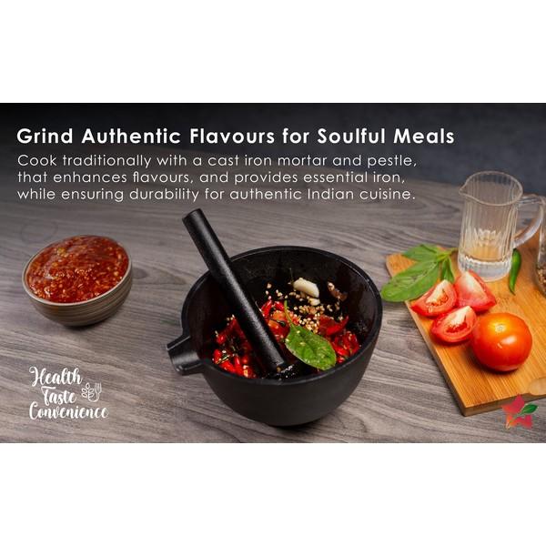 If you want to grind whole spices, nuts, or other cooking ingredients, the Wonderchef Forza Pre-seasoned Cast Iron Mortar and Pestle can help you do it all. It is a must-have item in your kitchen due to its convenience of use. This mortar and pestle also enhance the flavour of any food you make as it is made of iron. Additionally, this mortar and pestle gives the feeling of traditional pounding and grinding, thanks to its heavy and robust construction.