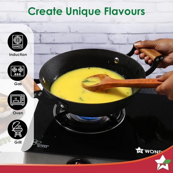 ENHANCED MULTI-LAYERED CONSTRUCTION: The Wonderchef Nigella Tri-Ply Kadhai’s aluminum core is sandwiched between two non-toxic, high-grade steel layers, providing exceptional heat conduction and unmatched durability for daily use.